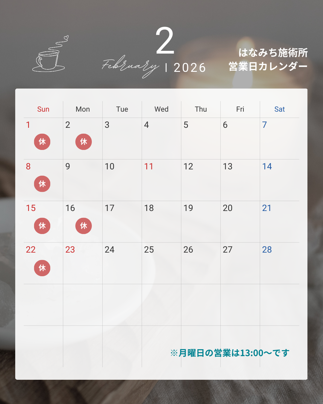 2日(月)・16日(月)は、休業日とさせていただきます。
