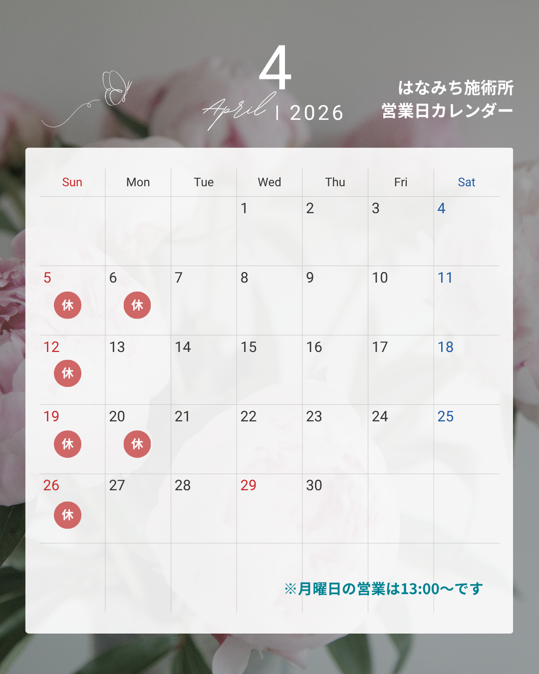 4日(月)・20日(月)は、休業日とさせていただきます。